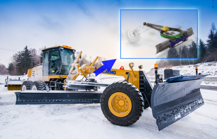 徐工平地機為高效除雪打造了專用除雪輔具:前部推雪板能快速清除積雪和浮雪,中部鏟刀兼備除雪與破冰功能,后部滾雪刷能將積雪掃到路沿,快速除雪保證道路通暢。