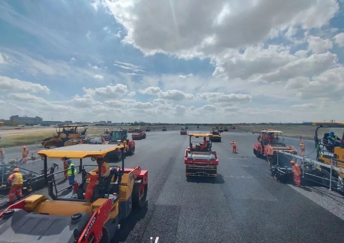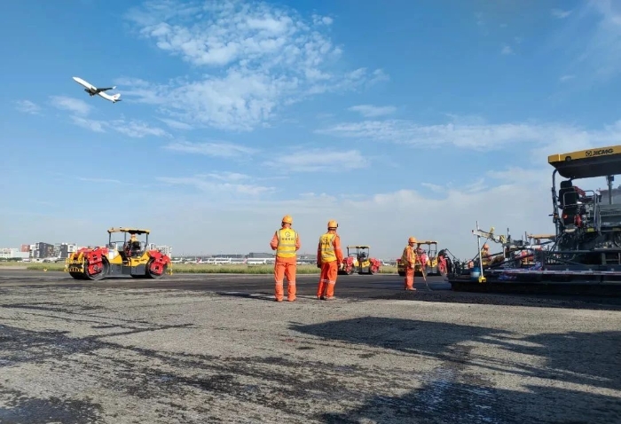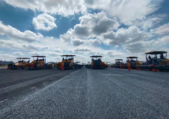 想象一下,航班在西跑道頻繁起降的同時,數(shù)百名施工人員和數(shù)百輛設(shè)備,就在幾百米外忙碌作業(yè)。施工挑戰(zhàn),前所未有的嚴(yán)峻。傳奇,在這短暫的15天一一上演。不過,這傳奇的紙簿上,亦被烙上“徐工金”的身影。徐工成套道路機(jī)械,在此項高難度施工中,迎難而上、挑起重?fù)?dān)。