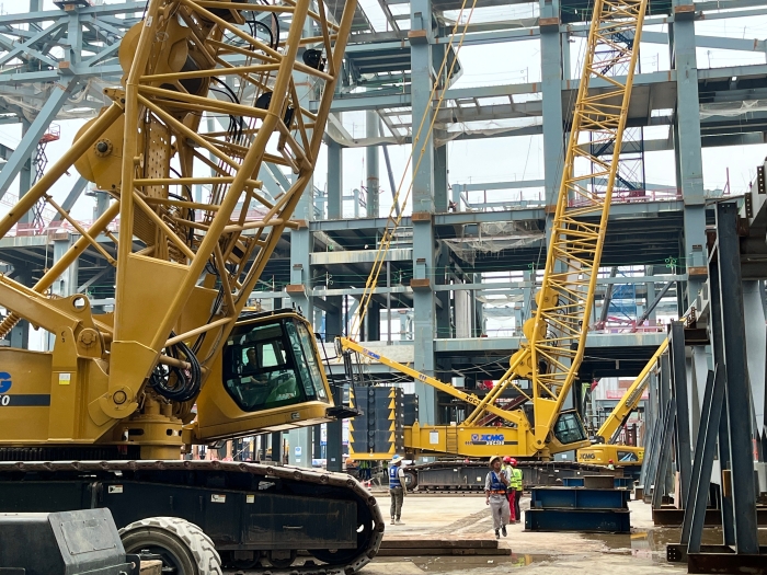 據該項目的相關負責人介紹,本次吊裝的72米大跨度鋼桁架重約160噸,因其長度特殊的原因,使用一臺履帶起重機無法完成吊裝作業,項目方在衡量履帶起重機產品吊重能力、穩定性、安全性等多方面后,決定使用兩款徐工XGC350履帶起重機搭配72米主臂工況,采取“原位拼裝+雙機抬吊”的吊裝手法完成本次施工。