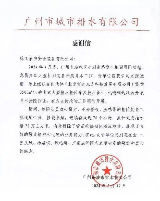 近日,徐工消防收到一封來自廣州市城市排水有限公司的感謝信,信中熱忱感謝徐工在廣州市海珠區某地地面坍塌險情中提供的高效、專業的設備及人員支持。