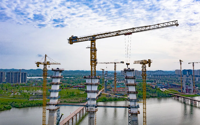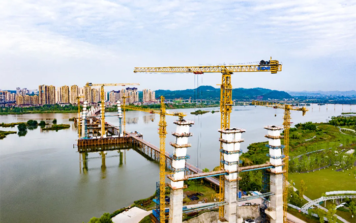 涪江六橋項目施工難度大、安全風險高,塔柱節段構造復雜,異形塔柱節段需要塔機吊裝時能靈活轉向,同時施工材料距離橋面安裝高度較高,各鋼結構更需要精準對接,運行平穩精準、吊裝能力強的XGT1350-64S、XGT6015-8S1成為項目的不二之選。