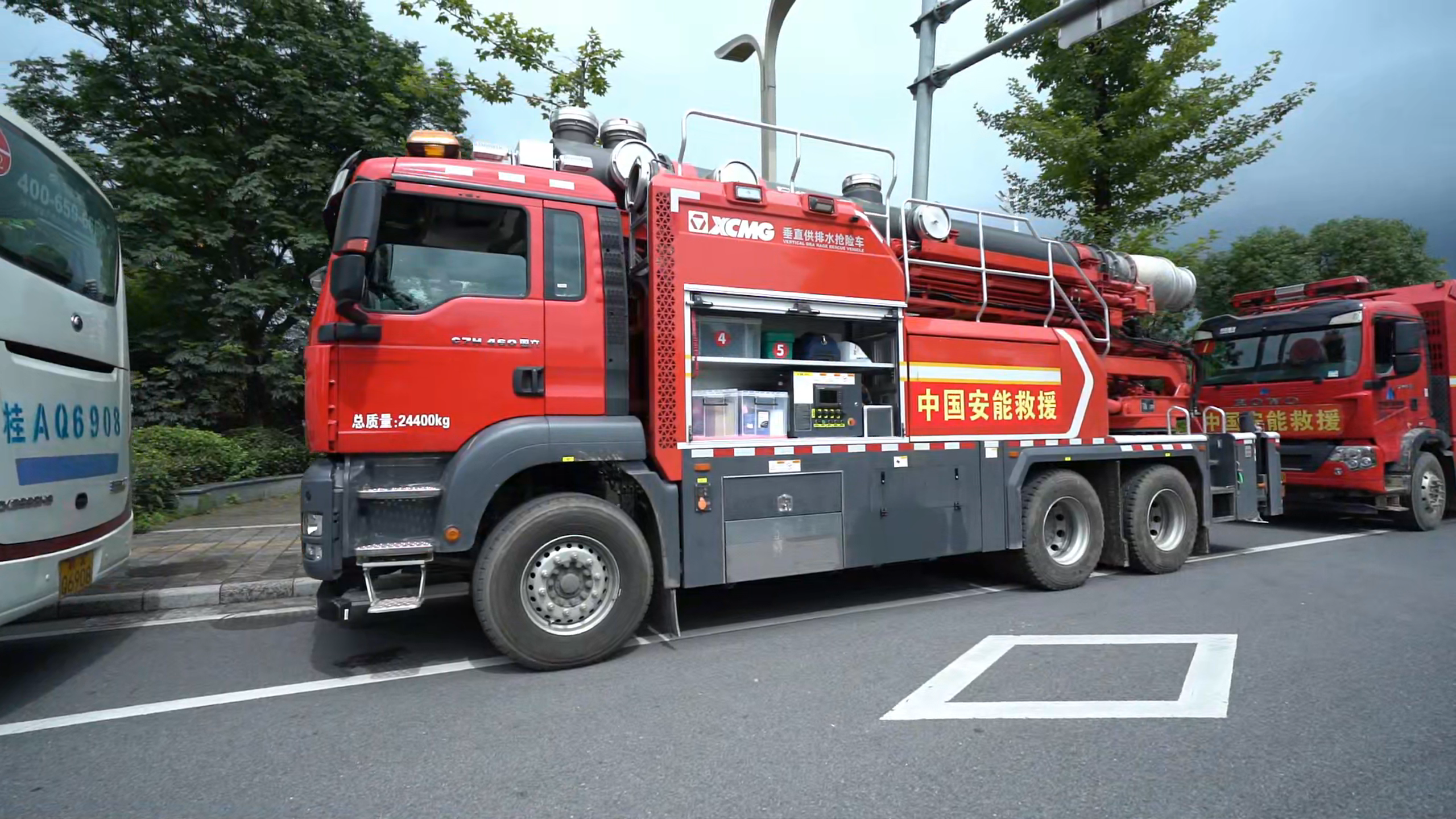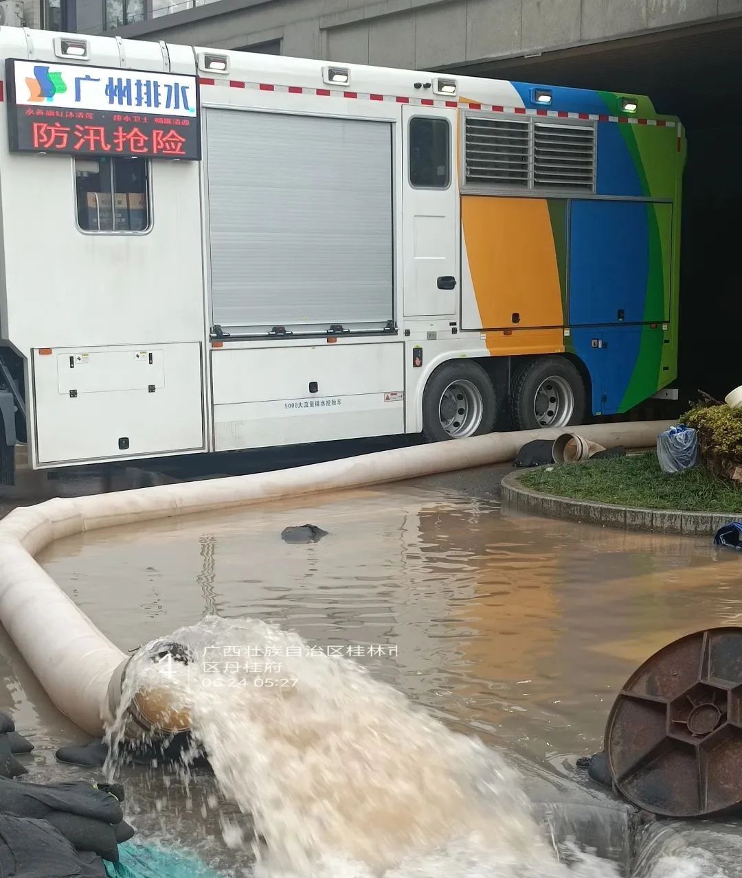 除桂林站地下停車場之外,徐工排澇產品還參與了桂林丹桂府小區以及大河圩旁的地下車庫內澇救援任務。