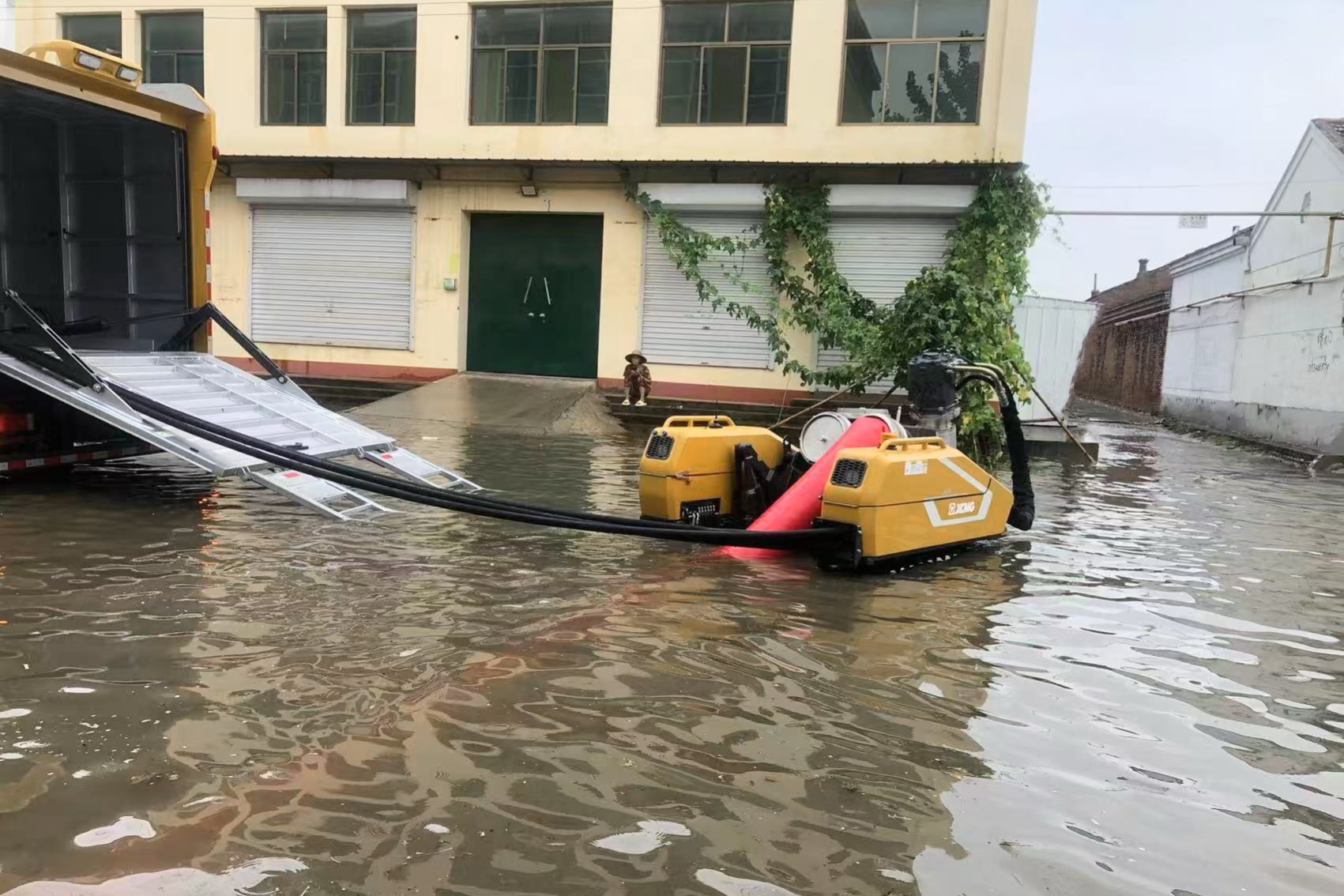 徐工排澇產品各元器件防水等級均達到IP68,控制箱全密封,PS30F4的子車配置30cm的履帶底盤,可實現24h全浸沒作業,面對70公分的水深,輕松“拿捏”,給當地居民帶來滿滿的安全感。救援人員將車輛轉移至最深淹沒處,水帶增長至180米,流量達2500立方每小時。經過近10小時連續運轉,路面積水下降50余公分,排水量超20000立方。徐工排澇裝備的硬核實力獲得當地居民一致好評。