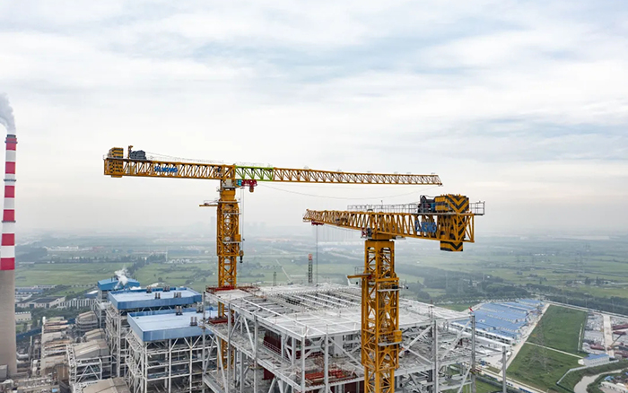 側望長江畔,機器轟鳴、江水潺潺,華能太倉電廠機組擴建項目施工現場一派繁忙景象,XGT3100-160S、XGT1350-64S兩臺徐工超大塔穩穩矗立在高聳的鋼架間吊裝作業。