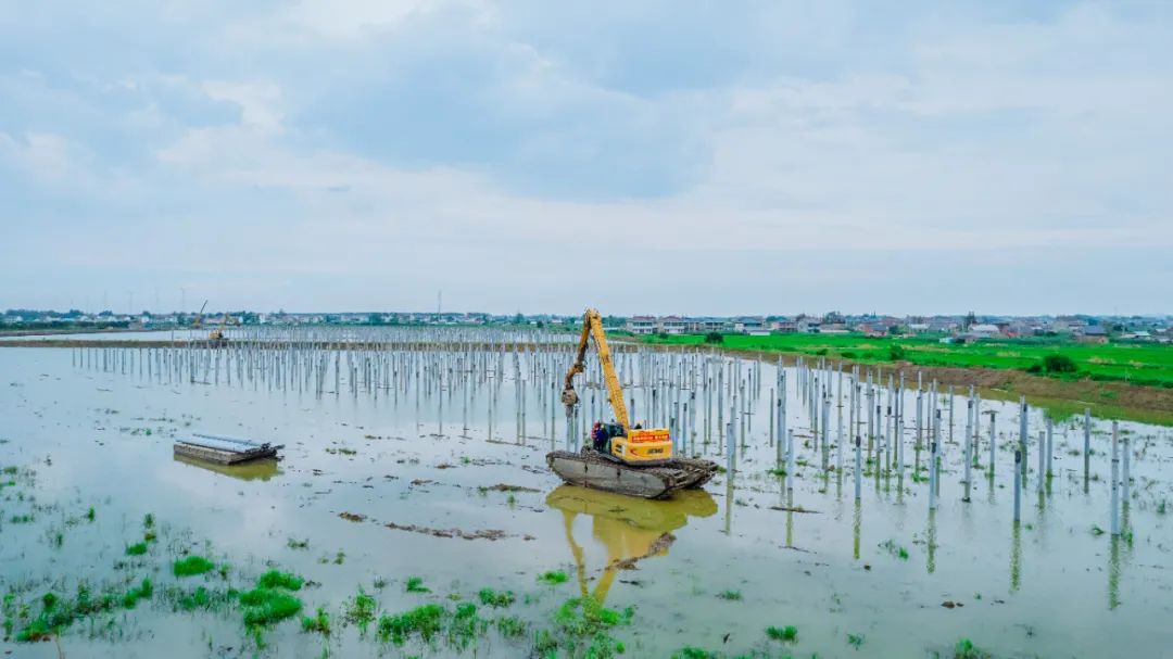在漁業較為發達的濱海港鎮,“漁光互補”光伏發電項目建設正如火如荼,項目現場,徐工水上打樁機的身影隨處可見。