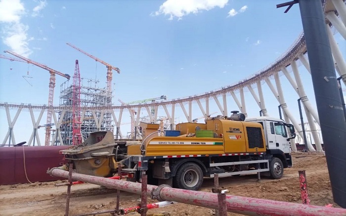 項(xiàng)目亮點(diǎn)之一的間冷塔,采用了創(chuàng)新的鋼管混凝土X柱結(jié)構(gòu),單柱高達(dá)30米,重達(dá)51.9噸。然而,隨著泵送高度的攀升,混凝土黏度急劇增加,泵送過程中極易出現(xiàn)憋壓熄火現(xiàn)象,對(duì)施工設(shè)備提出了前所未有的要求。