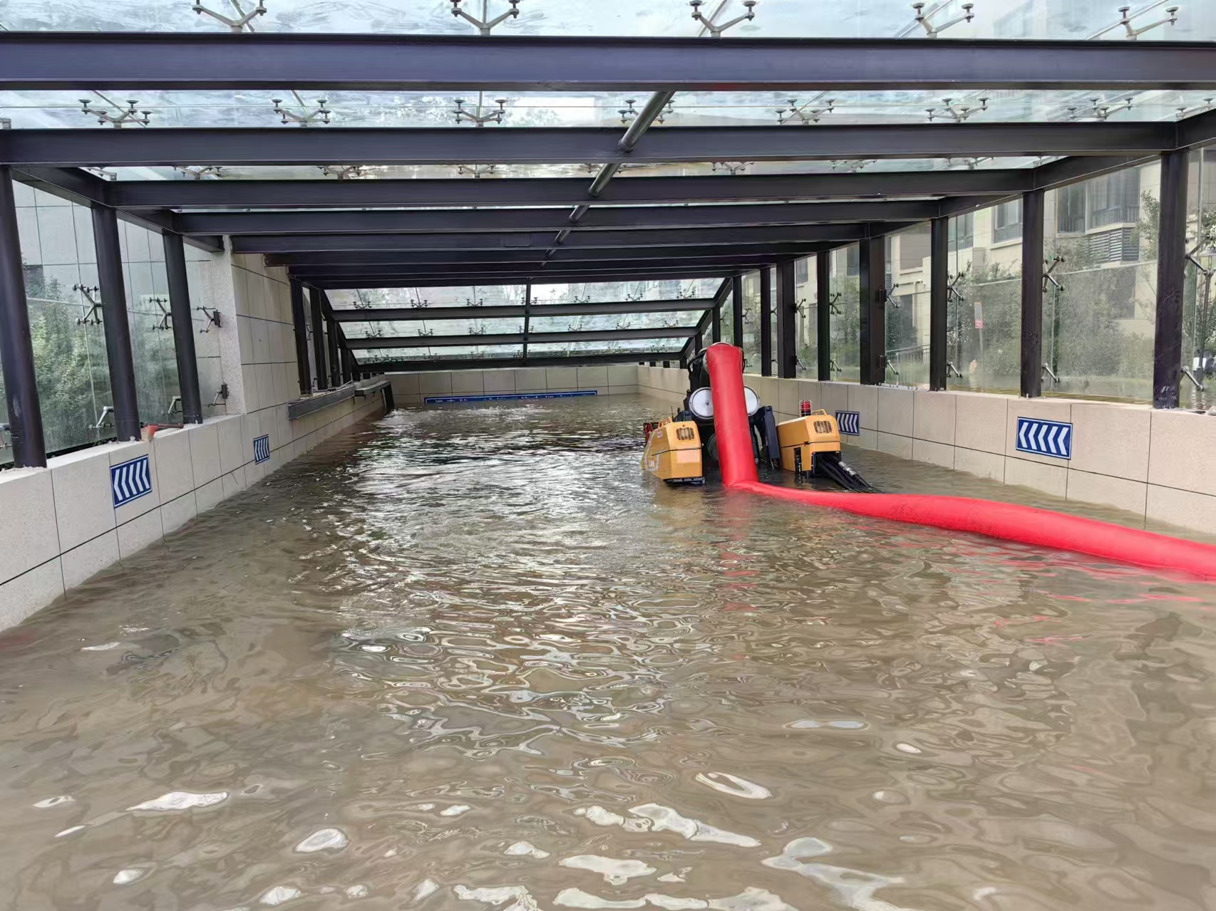 到達(dá)現(xiàn)場(chǎng)后,救援隊(duì)立即開(kāi)始鋪設(shè)水帶、檢查管路,憑借子母式排澇車可實(shí)現(xiàn)遠(yuǎn)程分離控制的功能,救援人員將PS50F停至地下車庫(kù)入口處,鋪設(shè)240米超長(zhǎng)水帶,遙控子車探入斜坡30余米,水泵沒(méi)入積水進(jìn)行抽排水。連續(xù)工作40小時(shí)后,PS50F排除積水超80000m3,內(nèi)澇隱患得到有效控制,獲得現(xiàn)場(chǎng)居民一致點(diǎn)贊。