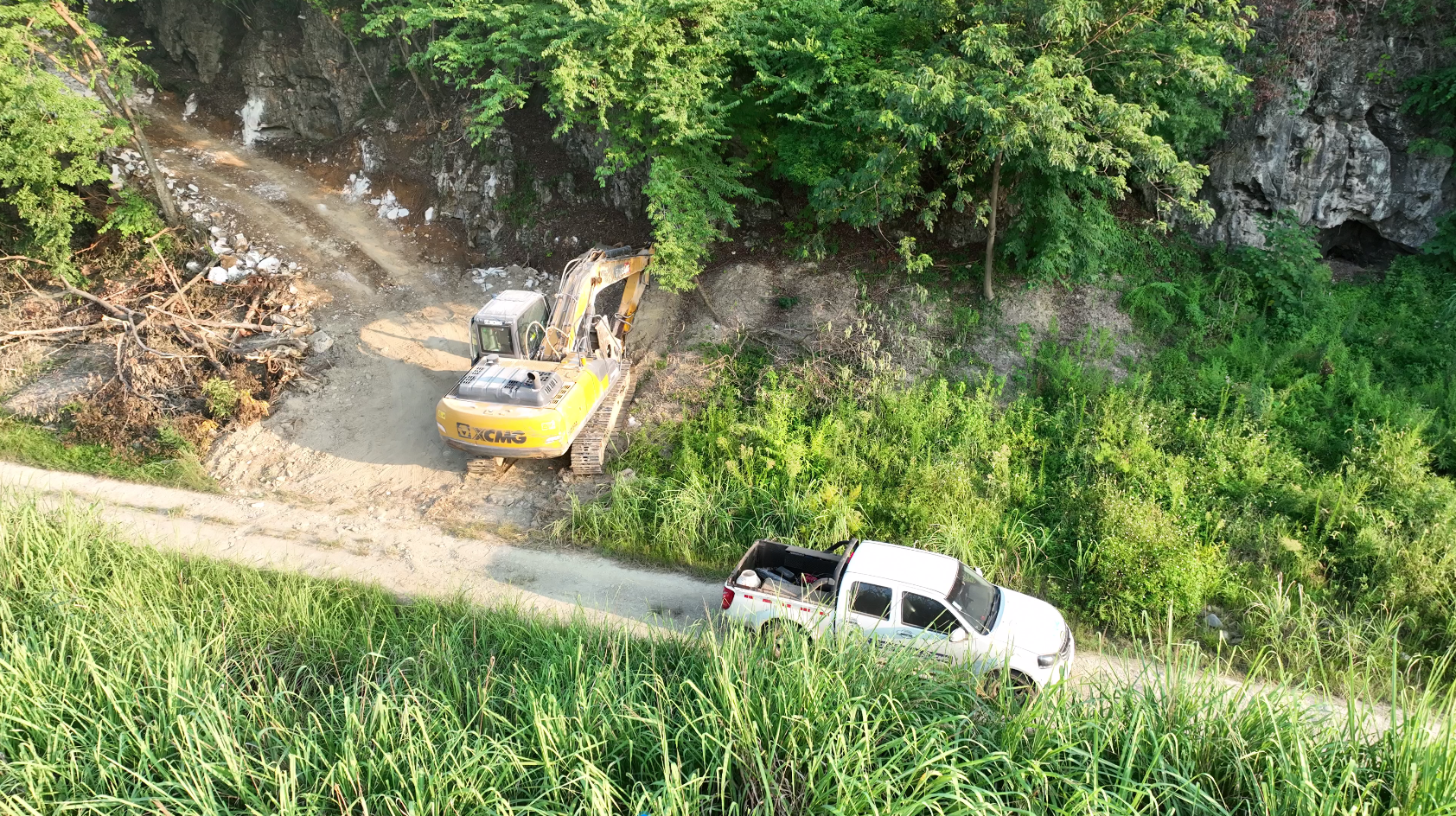密不透風的山林將正在作業的挖掘機完全擋住,只聽見破碎錘的聲音。