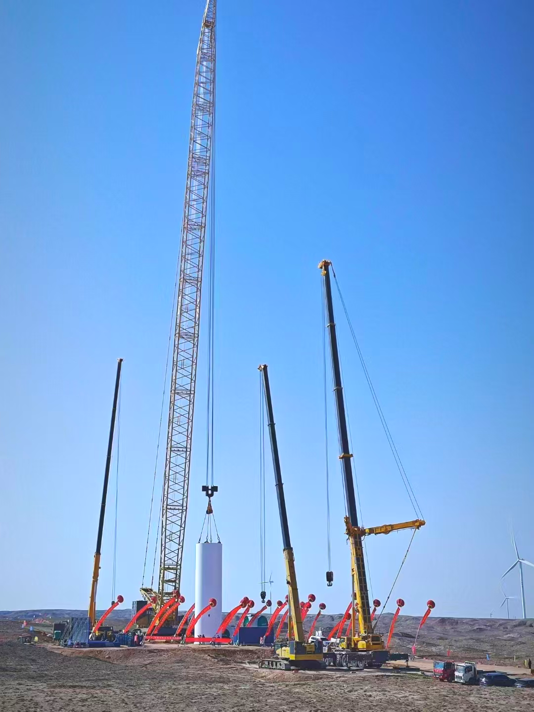 隨著施工號(hào)角吹響,各臺(tái)起重機(jī)緊密配合,XLC18000M采用138+8m的標(biāo)準(zhǔn)風(fēng)電工況,穩(wěn)穩(wěn)將98m長的葉片與112t重的輪轂、葉片在百米高空精確連接到機(jī)艙,XGTC160-I、XCA600L8 和 XCA200L8_2則靈活調(diào)整位置,輔助完成關(guān)鍵部件的吊裝,整個(gè)吊裝過程精確無誤。