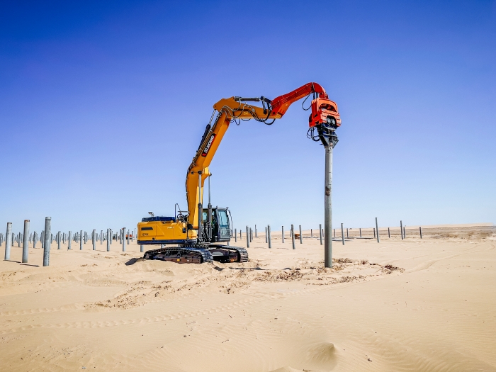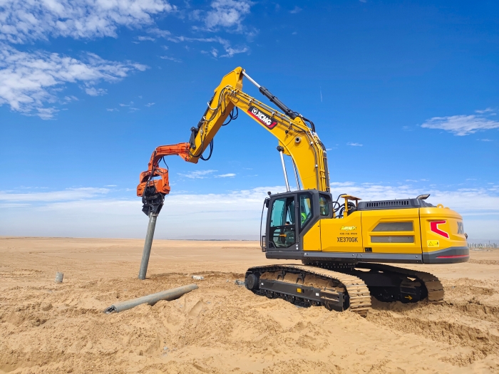 與以往常規(guī)項(xiàng)目不同,此次徐工挖掘機(jī)主要擔(dān)任光伏樁的鋪設(shè)工作,通過改裝振動(dòng)錘和引孔機(jī)等多功能屬具,有效滿足現(xiàn)場(chǎng)多元化施工需求。