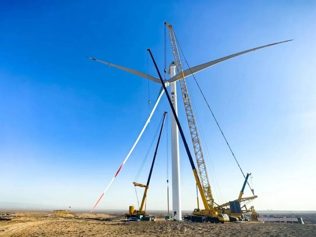 西北戈壁10萬千瓦風電項目現場,徐工輪履產品集聚,上演著多機協同的吊裝攻堅戰。