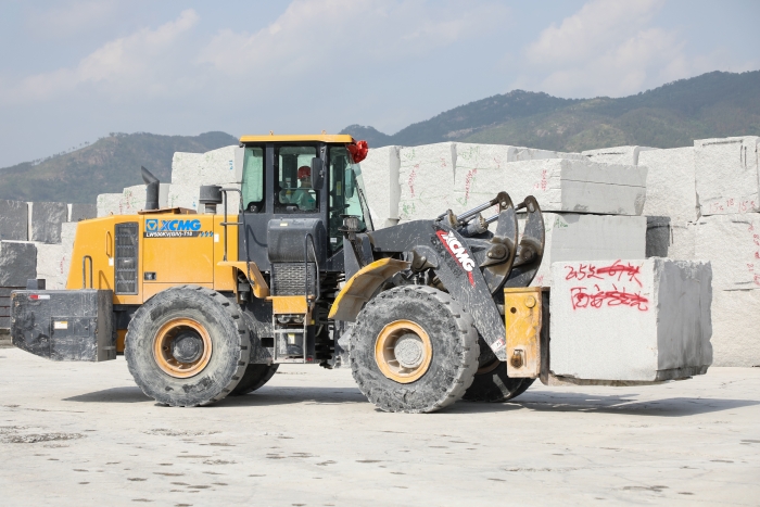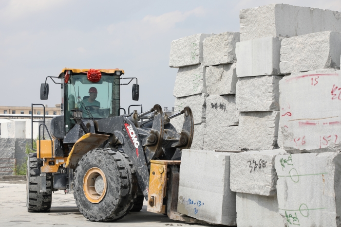 高檔花崗巖石材,以其優(yōu)美的外觀、堅(jiān)硬的質(zhì)地,一直是公共設(shè)施外立面裝飾的首選??蛻粲玫倪@臺(tái)徐工LW500KV(GIV)-T18石材叉裝機(jī)已在石材加工廠使用兩年,“相比過去用的車,操控輕松方便,視野很開闊,在復(fù)雜工作環(huán)境下也非常穩(wěn)定可靠,干活效率高。”駕駛員對(duì)徐工石材叉裝機(jī)贊賞有加。
