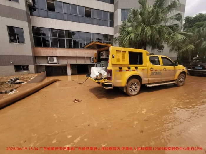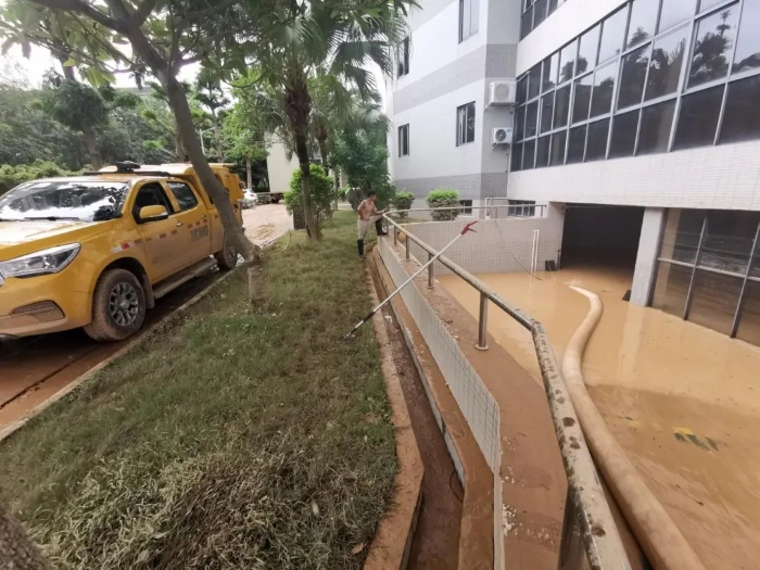 懷集縣人民檢察院地下車庫遭大量積水倒灌,水位迅速上漲,停放車輛和設施面臨嚴重威脅。由于地下車庫空間狹窄,大型救援車輛難以施展身手,排澇工作陷入困境。