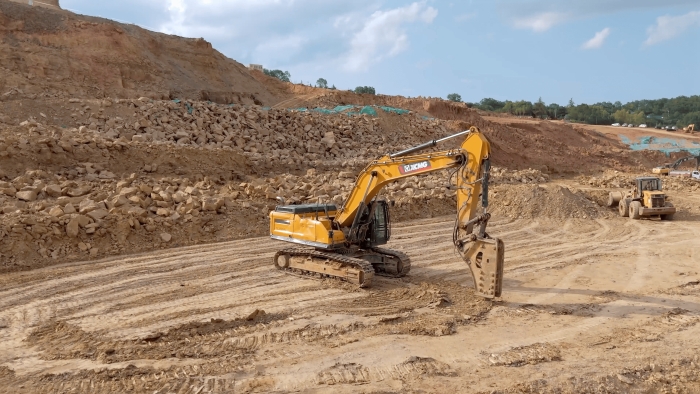 徐工挖掘機(jī)打破碎很有勁,駕駛舒適。我們?cè)谶@個(gè)項(xiàng)目上主要做巨石破碎工作,徐工的設(shè)備在回轉(zhuǎn)、破碎等動(dòng)作上都表現(xiàn)的很優(yōu)秀,屬具更換很便捷,底盤比其他品牌的同噸位設(shè)備都要穩(wěn)。