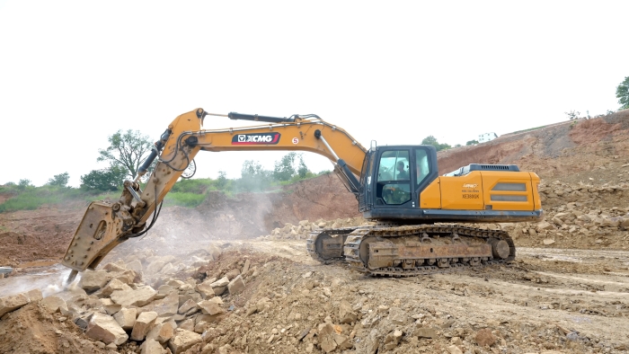 站前區(qū)堆積的大體積巖體,正被徐工XE380GK的破碎錘系統(tǒng)轉(zhuǎn)化為可再生建材。