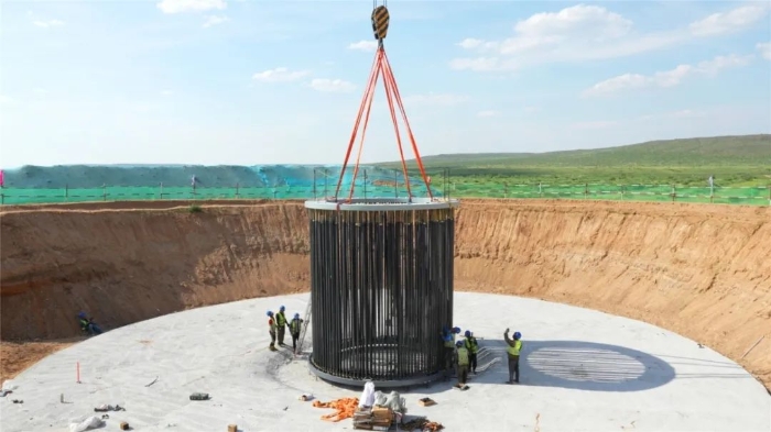 此次進行的是風電基礎吊裝,重達17噸的鉚盤穩落在基坑,214根鉚桿密集插裝,每一根都必須精準插入孔位。