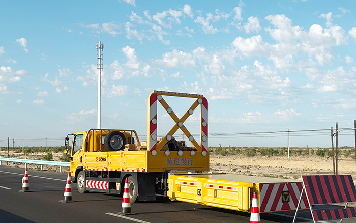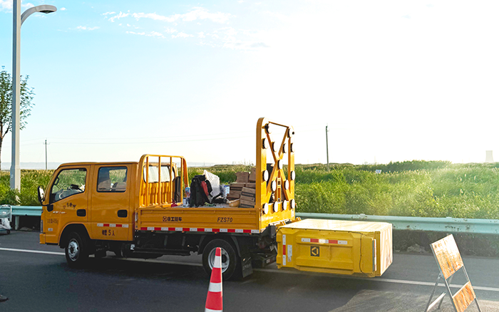 不光是安全衛(wèi)士,它們還是高效的 “移動倉庫”。貨箱敞開著,里面整齊碼放著鐵鍬、瀝青、警示錐等施工所需的工具和材料。施工時,人員無需來回奔波取物,伸手就能拿到需要的東西,讓施工節(jié)奏得以加快,省去了不少麻煩。當(dāng)施工收尾,防撞緩沖車駛離后,留下的不僅是平整的路面,更有它們?yōu)檫@次施工全程護航的印記。