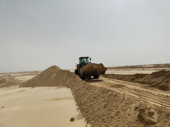 當地金光閃耀的沙漠地帶是極具標志性的景觀,數臺徐工ZL50GN裝載機正在其中緊張作業。擔負起土方搬運、路基平整、材料裝卸等關鍵任務,在高溫、多塵的惡劣環境下依然表現出眾,成為不可或缺的重要力量。
