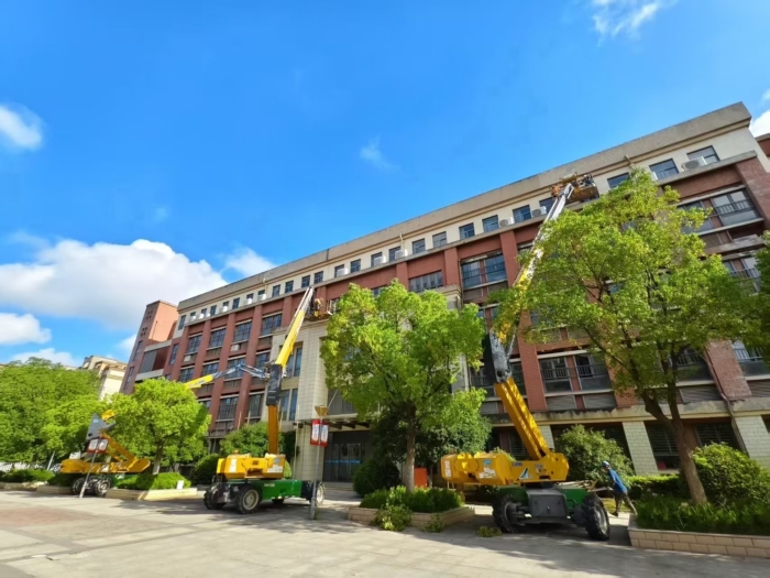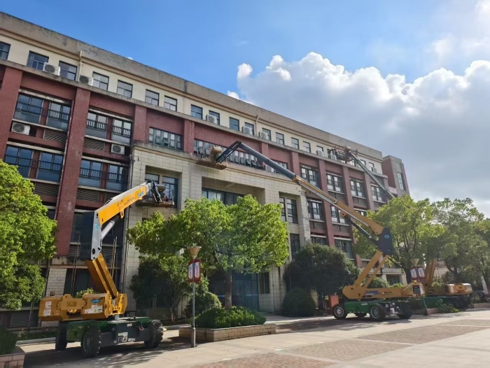 此次施工通過使用徐工高空作業設備,有效避免了傳統腳手架對校園場地占用大、搭設周期長的影響,體現了現代化施工設備在校園維修改造中的顯著優勢。