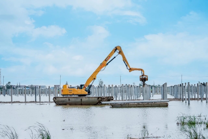 在吳總的團隊中,徐工XE300GP水上打樁機更是大放異彩,單日最高可完成近300根樁的任務量。相較于傳統的船打模式,徐工水上打樁機采用浮箱結構底盤,作業時浮箱直接接觸地面,穩定性更好,不用擔心側翻,打樁力度更大,而且可以在水面上自由移動,施工效率至少提升1-1.5倍。
