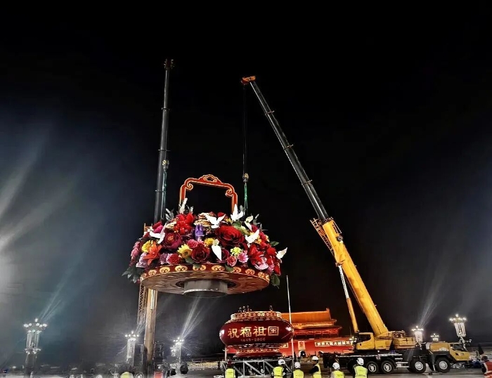 這已是徐工連續第十五年參與天安門國慶花籃吊裝任務。9月22日凌晨,兩臺徐工200噸級汽車起重機協同作業,將重達60噸的籃盤平穩起吊,與16米高的籃體實現毫米級精準對接。