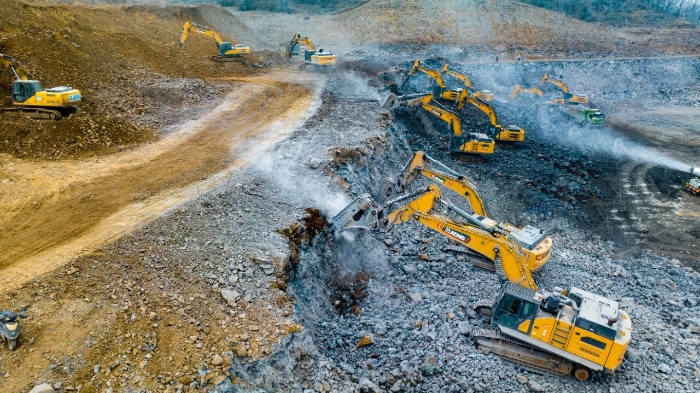 為確保工程節(jié)點,施工方經(jīng)多輪方案論證,最終引入了14臺徐工挖掘機組成的主力設備集群,承擔核心的山體破碎及土石料裝車任務。在總量高達300萬方的工程面前,徐工XE650GK、XE380K、XE335GK等機型展現(xiàn)出強大的工況適應性。其中,8臺明星機型XE650GK配備215型破碎錘,憑借其獨有的破碎多級調頻控制技術,在面對高硬度玄武巖時日均破碎量穩(wěn)定在1500噸以上,同時將油耗控制在約40升/小時,實現(xiàn)了效率與節(jié)能的出色平衡。