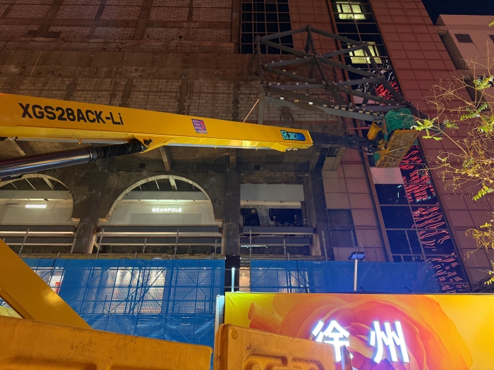 在徐州金鷹商場外立面,徐工XGS28ACK-Li曲臂式高空作業(yè)平臺靜靜矗立,施工人員在其工作籃內(nèi)精準完成焊接作業(yè),成為城市中心一道靚麗的施工風景線。