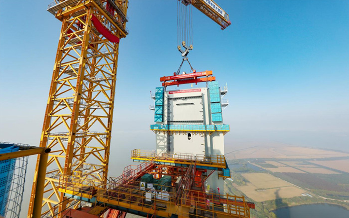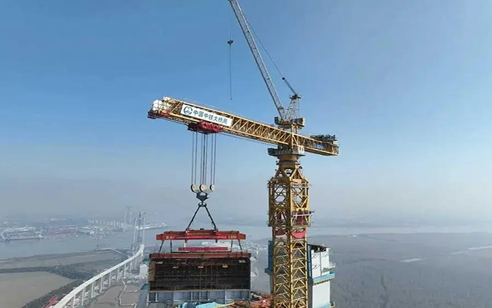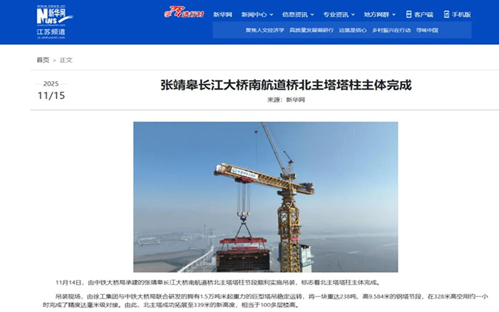 在靖江市馬洲島上空,重達(dá)238噸的T29鋼塔節(jié)段在徐工XGT15000-600S超級塔機(jī)的穩(wěn)定牽引下平穩(wěn)攀升,精準(zhǔn)完成高空對接,整個(gè)吊裝過程中,塔身始終穩(wěn)如磐石,為張靖皋長江大橋關(guān)鍵節(jié)點(diǎn)的突破提供了堅(jiān)實(shí)支撐。