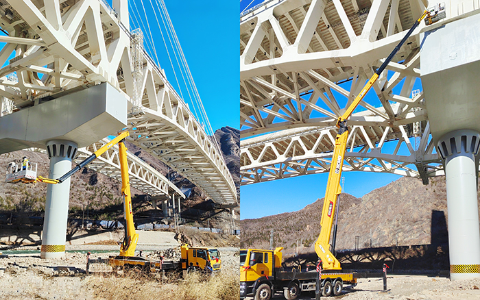 徐工 GKH65 高空作業車憑借強悍跨障能力,在這座關鍵橋梁的側面管路安裝施工中,盡顯硬核實力,為橋梁運維領域樹立全新技術標桿。