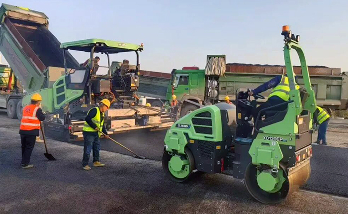 在河北道路施工中,徐工RP905HEV混動攤鋪機(jī)與XD120EP純電壓路機(jī)組成“新能源搭檔”。