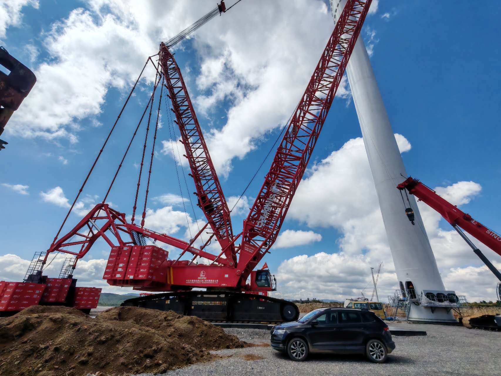 該設備憑借其強大的動力系統、靈活的履帶行走機構以及先進的智能控制系統,在起伏不平的施工場地中穩定移栽、精準定位,全程護航總計25臺大容量風電機組的吊裝任務,確保了工程進度按計劃推進。