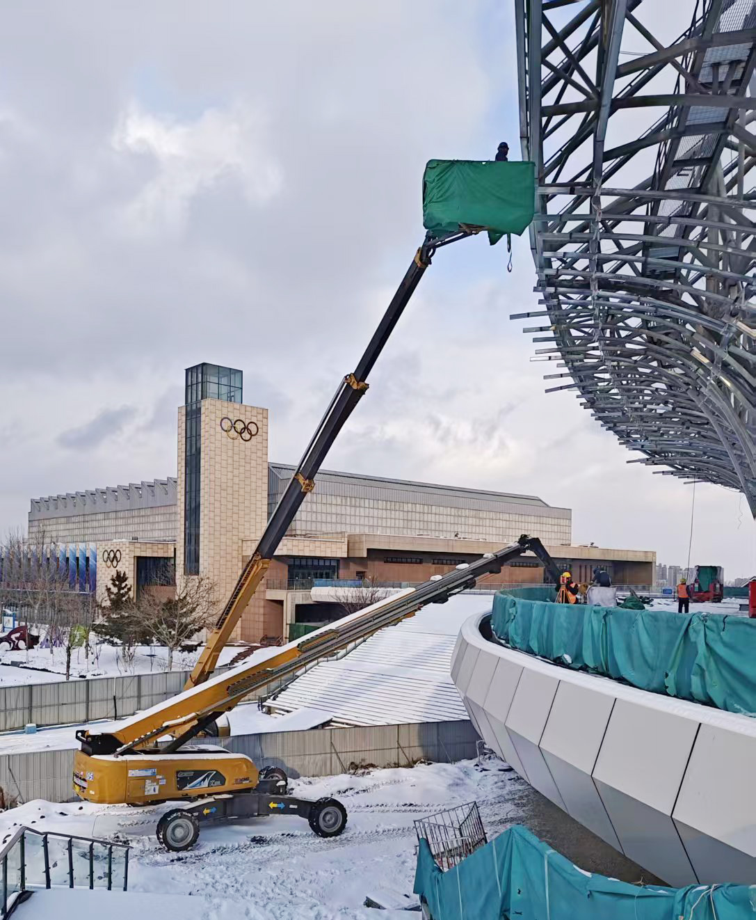 十余臺設備分工明確,40米級產品負責主體結構高空安裝,58米超大高度設備專攻網架制高點施工,30米級機型精準覆蓋附屬結構作業,形成全高度、全覆蓋的施工矩陣。