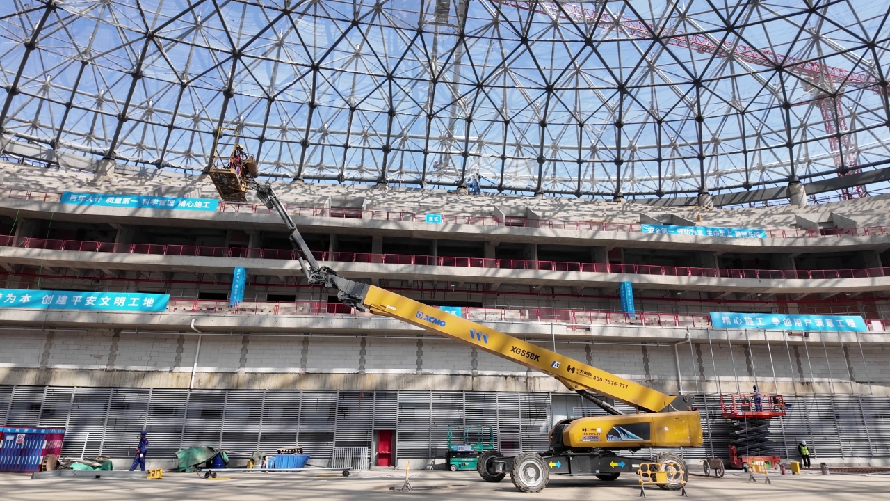 作為杭州余杭重磅文體地標,余杭國際體育中心體育館的高空施工正全力沖刺,穹頂鋼結構焊接、全域高空油漆施工同步推進,面對場館作業高度跨度大、鋼結構布局密集、施工精度與環保要求雙高的復雜工況,徐工XGS50K、XGS45ACK-Li、XGS58K多臺高空作業平臺協同發力,以全能表現攻克施工難題,成為場館建設的高空主力軍。