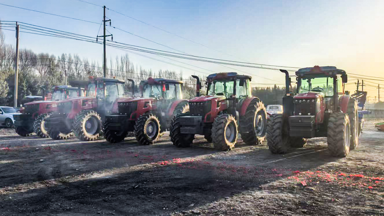 其中1臺徐工2204-6DK大馬力拖拉機,搭配液壓翻轉犁,以澎湃動力深翻沃土,每一次犁鏵翻轉都精準破茬、碎土、起壟,將深層土壤徹底喚醒,為作物扎根筑牢根基;4臺徐工1604-6BK拖拉機,掛載驅動耙同步作業,耙齒高速運轉,精準碎土、整平、保墑,一耙到位,讓地塊達到“地平、土細、墑足”的播種黃金狀態。